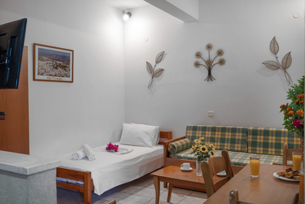 – Καθιστικό με δύο μονά κρεβάτια και δυνατότητα προσθήκης ενός ακόμα