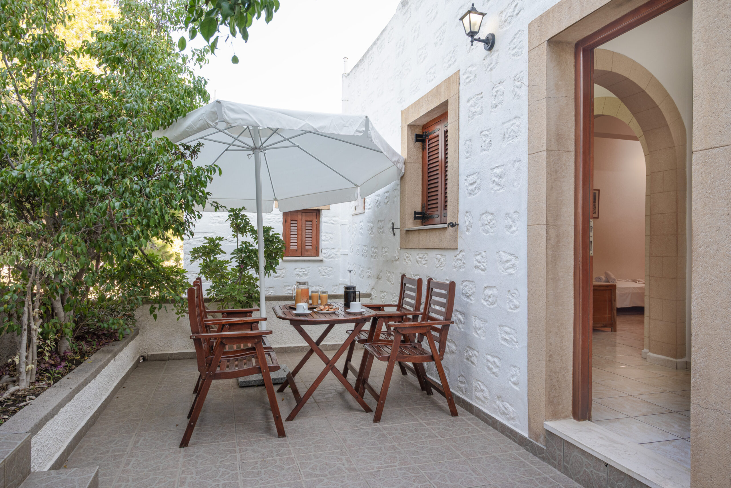 Η μεγάλη ατομική βεράντα με ξύλινο τραπέζι και καρέκλες σας προσφέρει μια μοναδική εμπειρία: απολαύστε το πρωινό σας ή ένα χαλαρωτικό γεύμα, μέσα σε καταπράσινο περιβάλλον με μαγευτική θέα στον κήπο και το βουνό. Ένας χώρος όπου η άνεση, η φύση και η χαλάρωση συνδυάζονται τέλεια για να κάνετε τη διαμονή σας αξέχαστη!