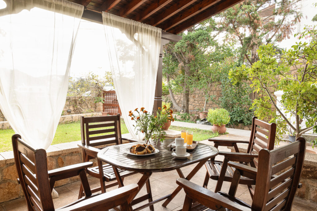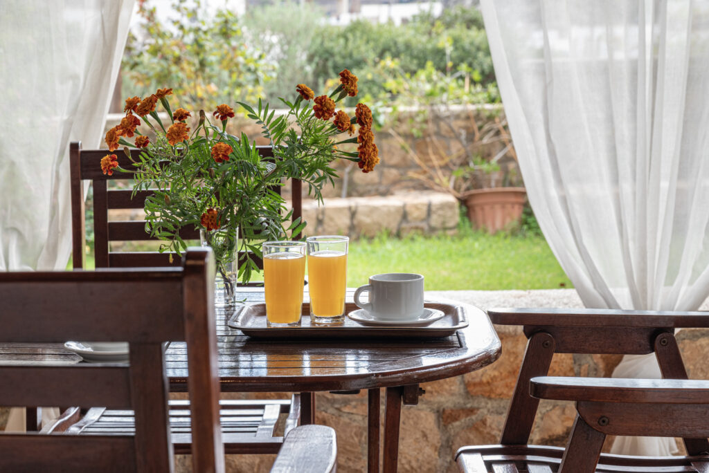προσκαλεί να απολαύσετε το πρωινό σας ή κάθε γεύμα, με θέα στον καταπράσινο